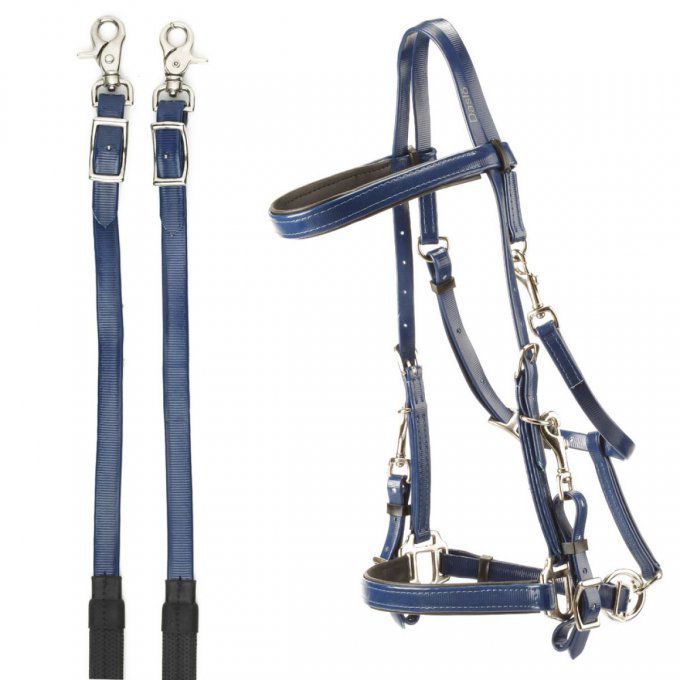 Bridon Daslo en PVC souple avec passepoils contrastés, livré avec des rênes caoutchouc.