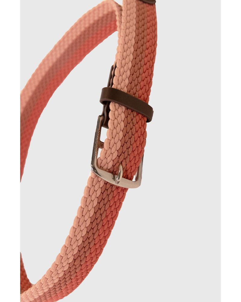 Ceinture Brume Pamplemousse HARCOUR unisexe, élastiquée et tricolore, avec extrémités en cuir et boucle gravée. Ajustable pour s’adapter à toutes les tailles avec élégance et confort.