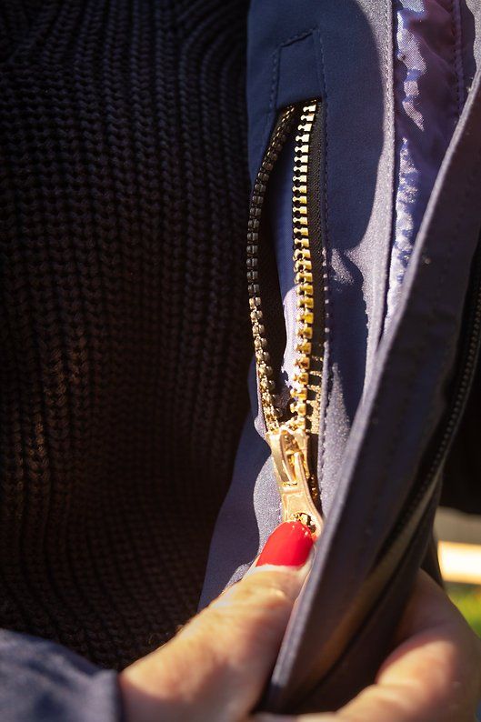Son coloris marine profond et son zip central discret confèrent à la Marguerite une allure à la fois sobre et raffinée. Le print Optitro contrasté longe la fermeture centrale pour une touche moderne subtile, tandis que les deux poches zippées dorées ornées de rabats élégants assurent praticité et finition soignée.