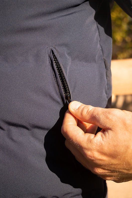 Son coloris marine profond et son zip central discret lui confèrent une allure moderne et sobre. Le print Optitro contrasté le long de la fermeture centrale apporte une touche dynamique et sportive, tandis que les deux poches zippées noires avec rabat assurent praticité et protection optimale.