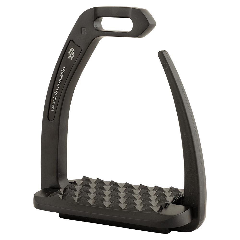 Le mécanisme de sécurité à charnière est en plastique qui se plie pour que le pied puisse être retiré de l’étrier. Le poids du cavalier permet de déclencher l'ouverture de l’étrier en cas de chute. De cette manière le pied ne reste pas coincé dans l’étrier. Dès que le pied quitte l’étrier, celui-ci se ferme automatiquement. La semelle est dotée d’un motif antidérapant afin que la saleté ne colle pas à l'étrier. La semelle d’étrier est légèrement inclinée, de sorte que le talon reste bien descendu. Le porte-étrivière biseauté assure une bonne position de l’étrier, de sorte que le pied soit en bonne position. Cela donne plus de stabilité au cavalier et améliore la position de la jambe.