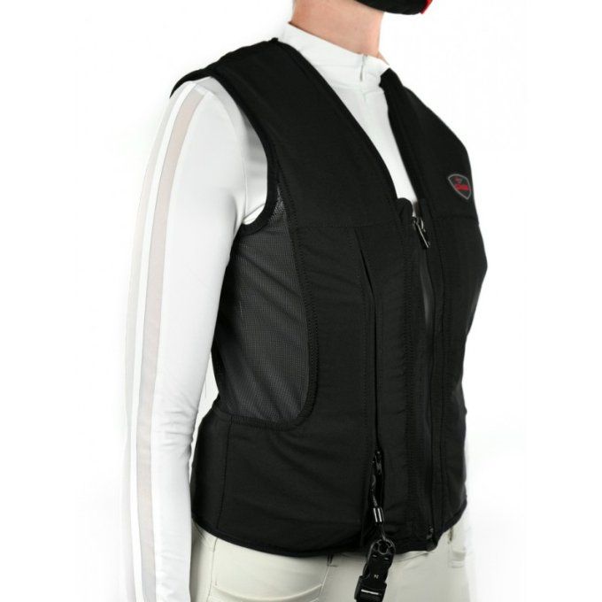 Il est équipé d'une cartouche de gaz remplaçable et protège l’ensemble du haut du corps, des vertèbres cervicales jusqu’au coccyx, grâce à l'air libéré dans la membrane intérieure lorsque la cartouche est déclenchée. Il protège également le cou grâce à une hauteur d'épaule suffisante. Une fois gonflé, le gilet absorbe les chocs, le cavalier est amorti lorsqu'il heurte le sol et sa tête est maintenue en place.
