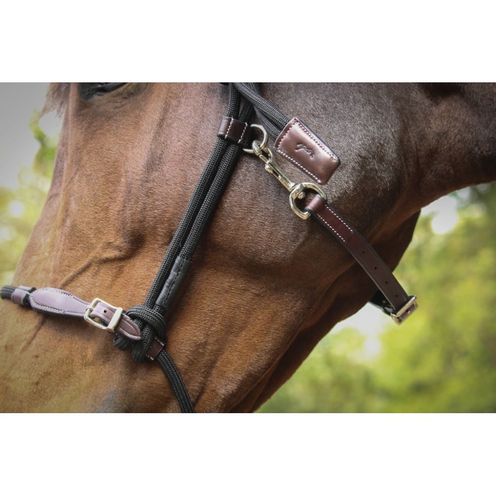 Pour répondre aux caractéristiques des fameux licols à nœuds, le Licol éthologique Pénélope se ferme par un nœud sur le côté de la tête et possède un anneau d'attache de longe coulissant sous la muserolle.