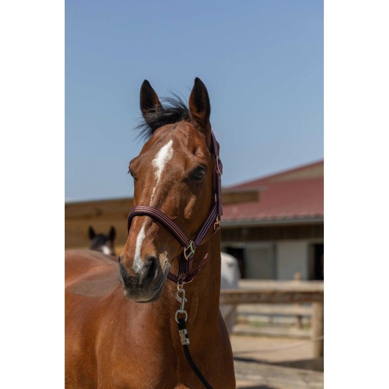 - Pratique : Têtière et muserolle réglable avec mousqueton de sous gorge.
