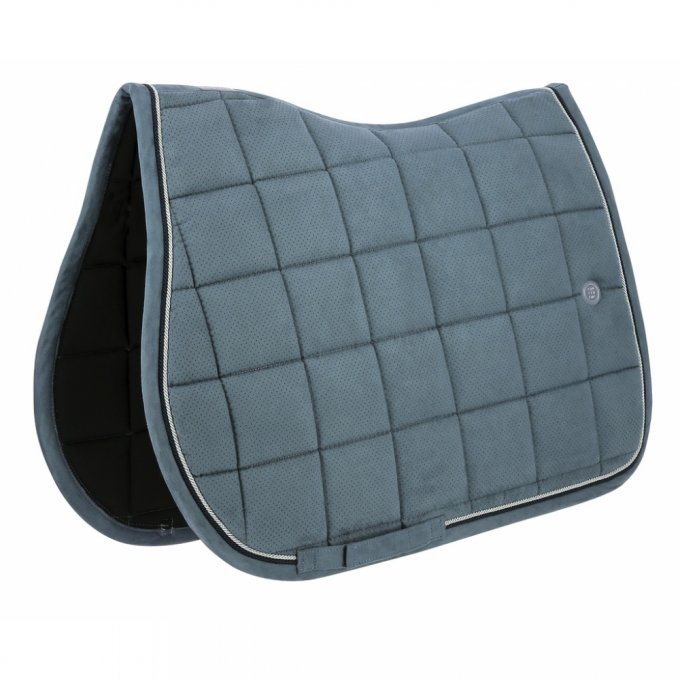Doux au toucher, le Tapis de selle EQUITHÈME Suède est sobre et bien fini avec un piquage carré et une double tresse sur son contour.
