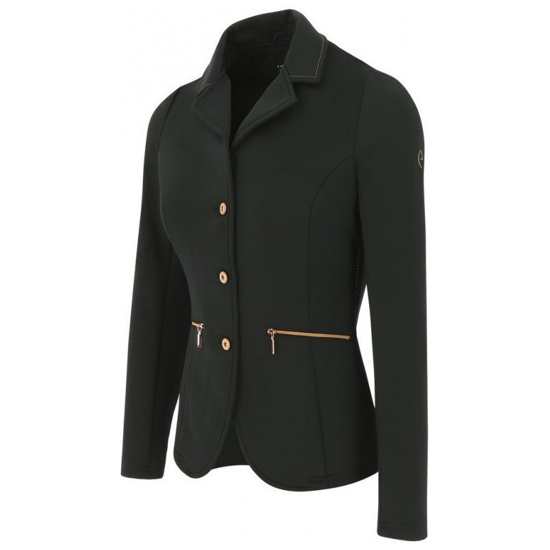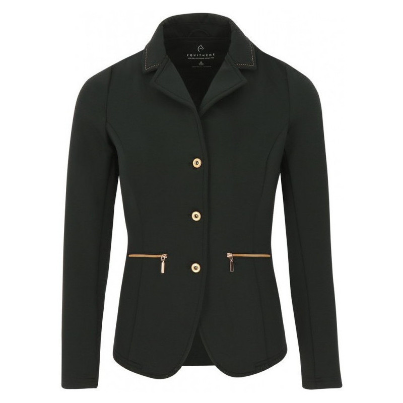 Dotée d'une fermeture à glissière cachée sous le rabat de sa boutonnière, la Veste de concours EQUITHÈME Athens possède de jolis boutons couleur rose gold, tout comme les zips de ses 2 poches pour les mains.
